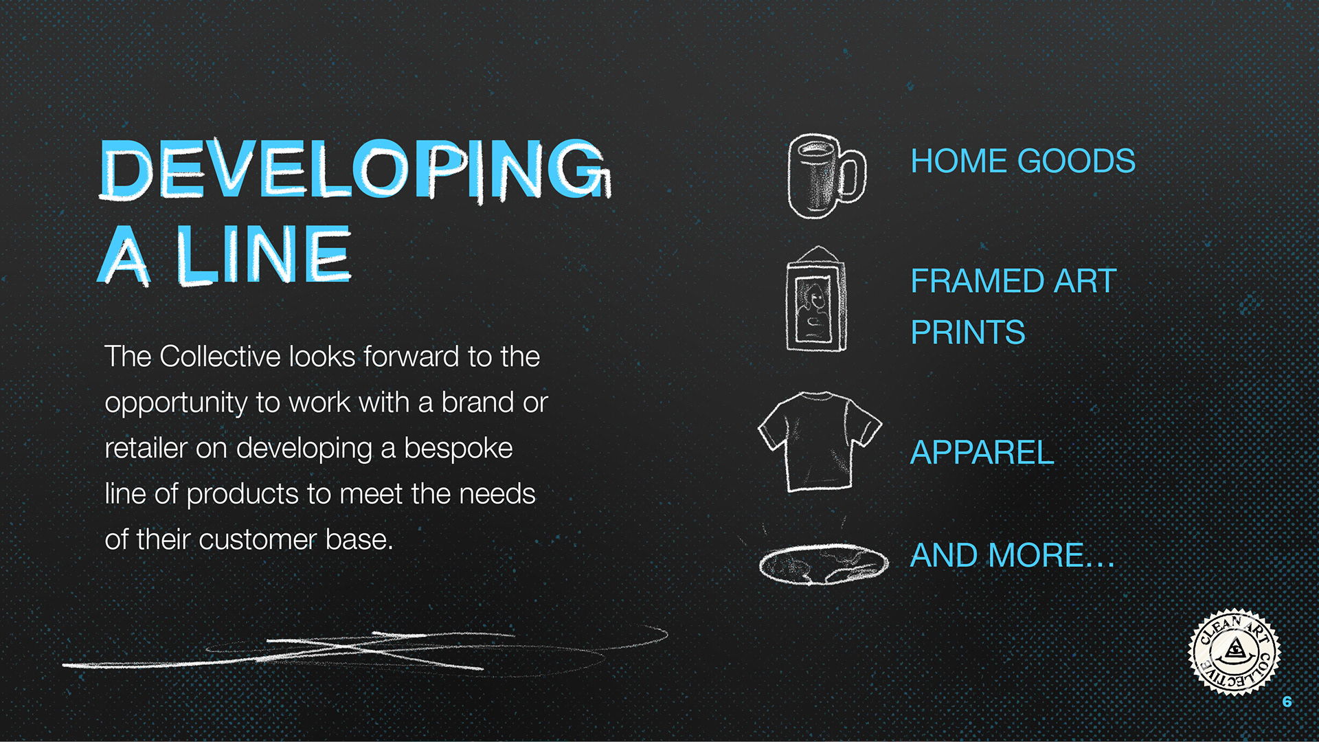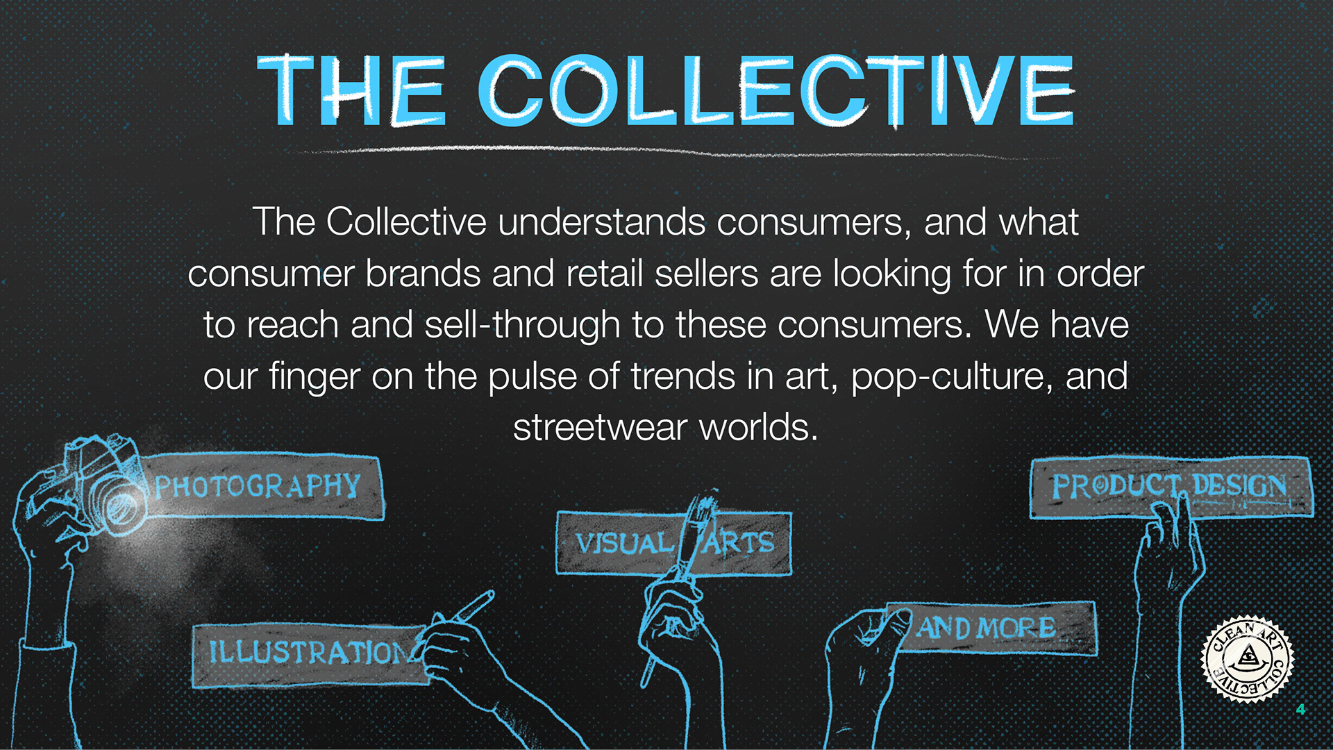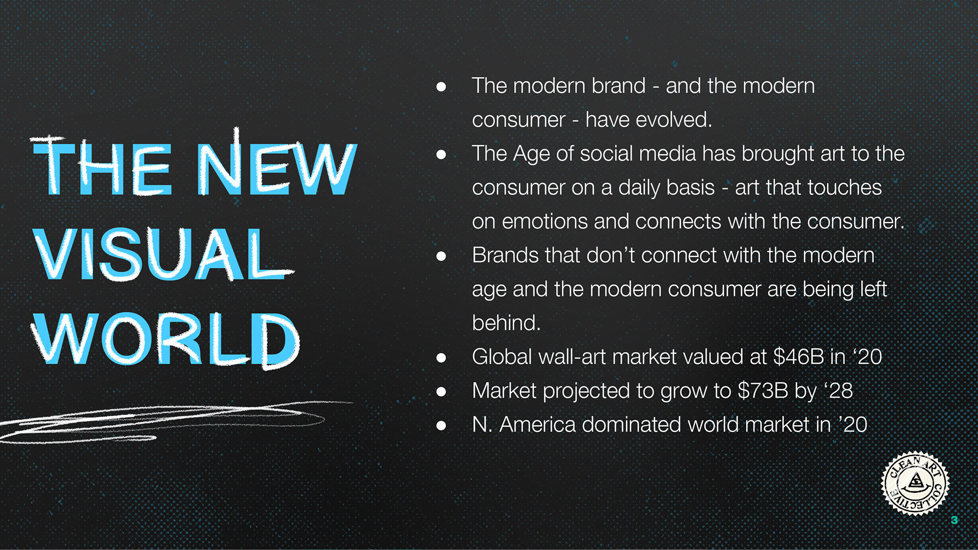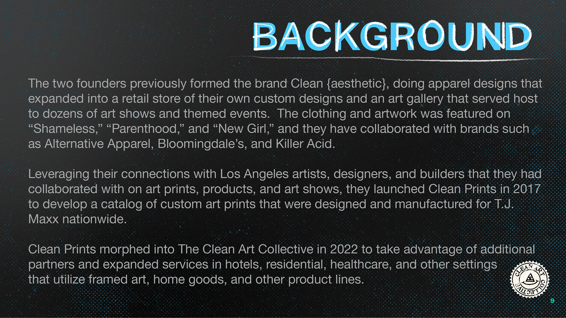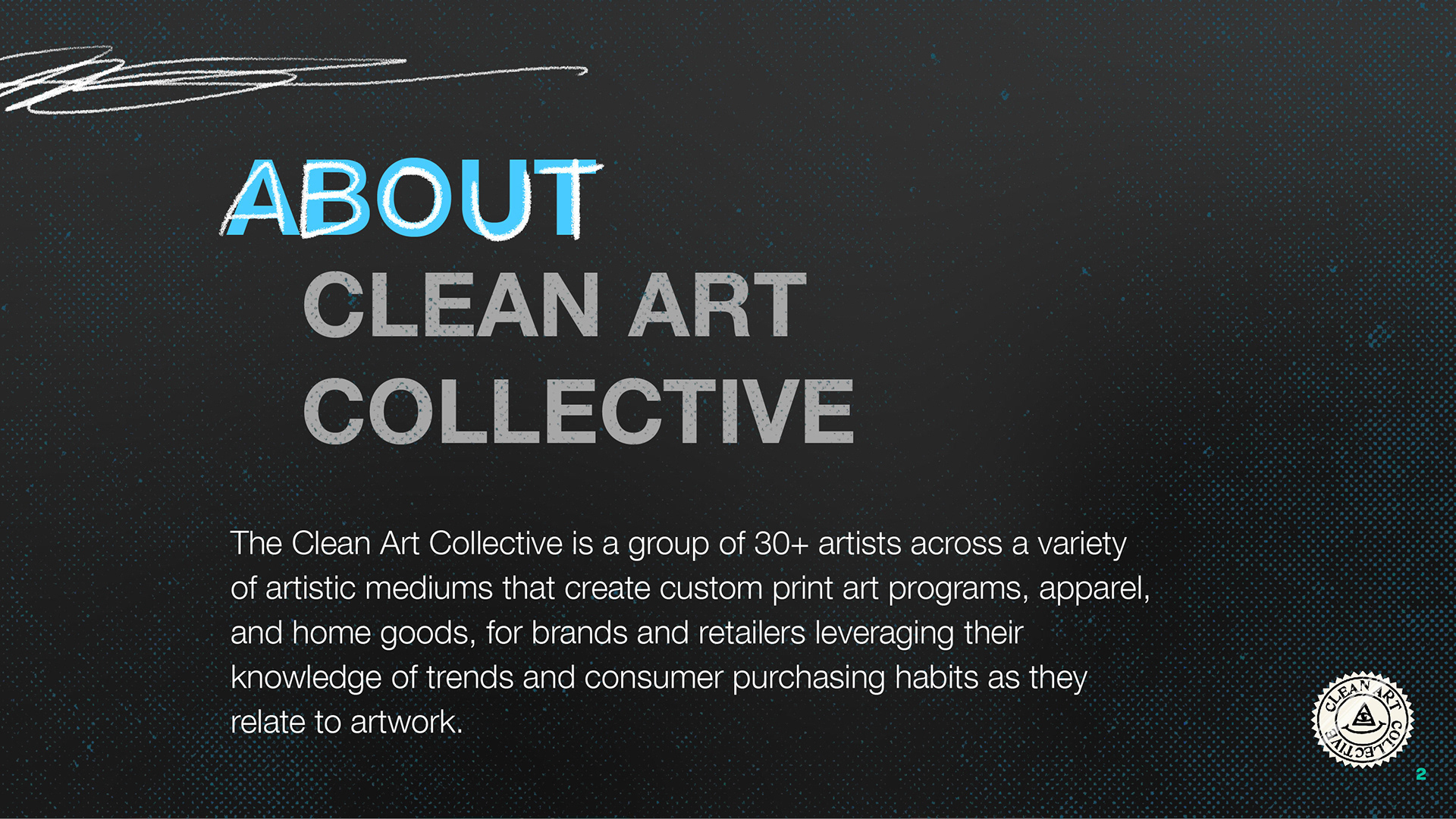 Pitch deck for the Clean Art Collective, a global home decor brand focusing on art prints, home style, and earthenware. Designed and branded by Charlie in 2022.